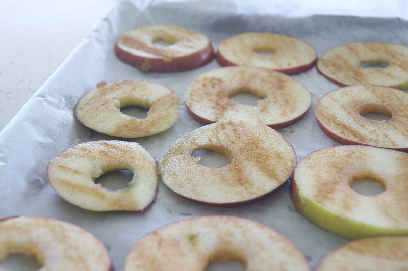 + Core the apples and slice into about 1/4 inch rings. I prefer leaving the skin on, but you can peel them if you wish.