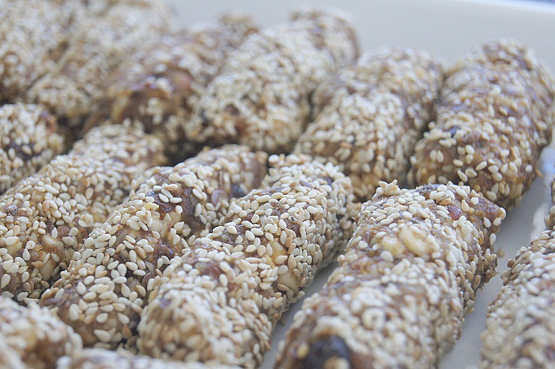 + With your sesame seeds on a plate, roll heaped teaspoons into small logs and roll in the seeds