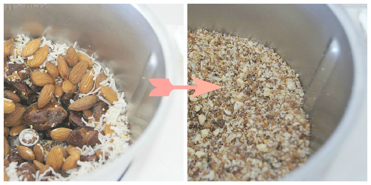 + Next blend (I used my thermomix) the dates, almonds, sunflower seeds and coconut. Here you can keep the texture as chunky or fine as you like.